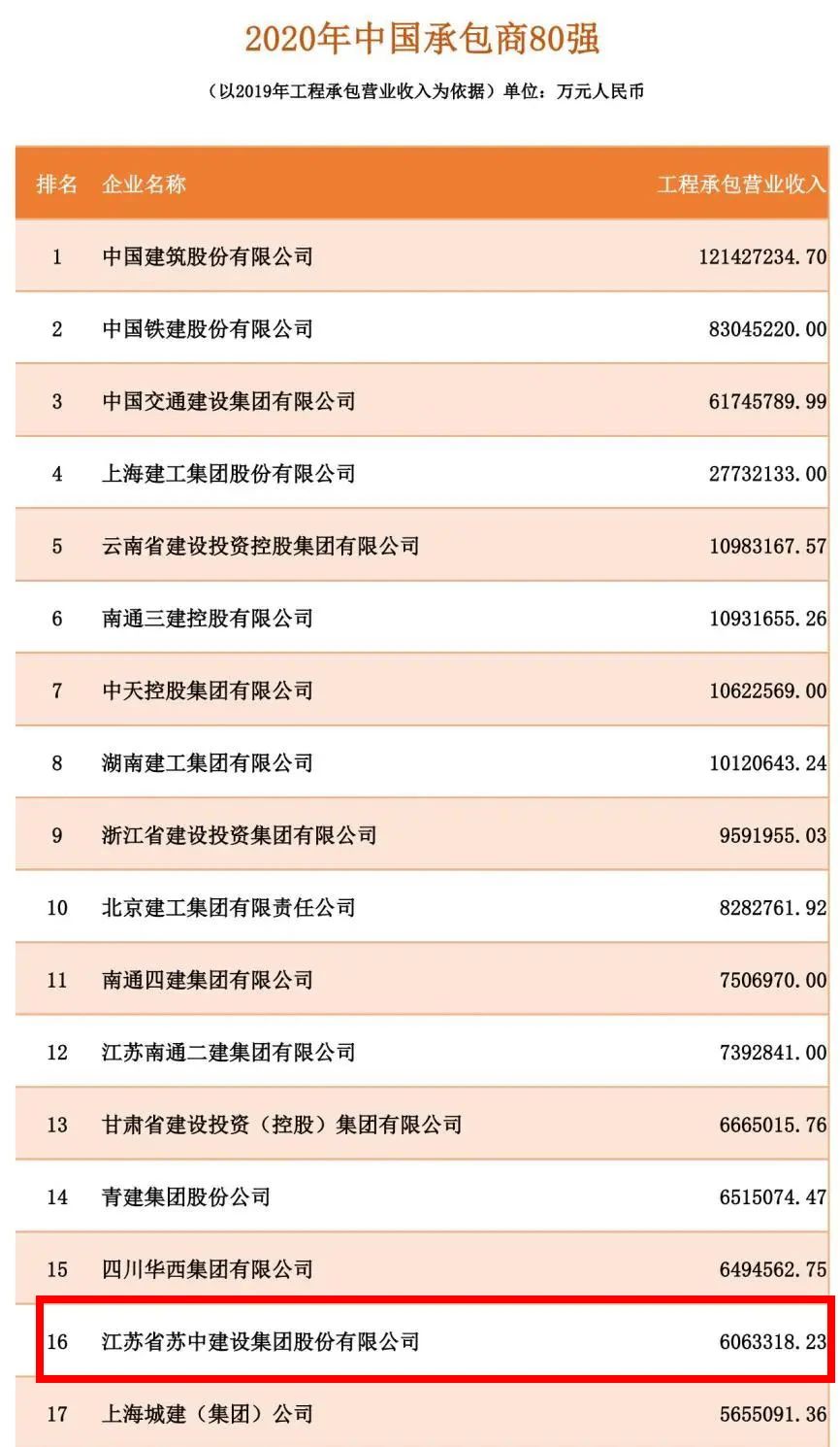 11月27日,2020ENR/建筑時報“中國承包商80強和工程設計企業60強”頒獎典禮暨中國建筑業行業精英論壇在南通舉行,會上發布了2020ENR/建筑時報“中國承包商80強和工程設計企業60強”榜單,蘇中建設以工程承包營業收入606.33億元榮列中國承包商80強第16位,連續17年登榜。