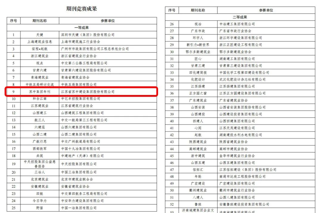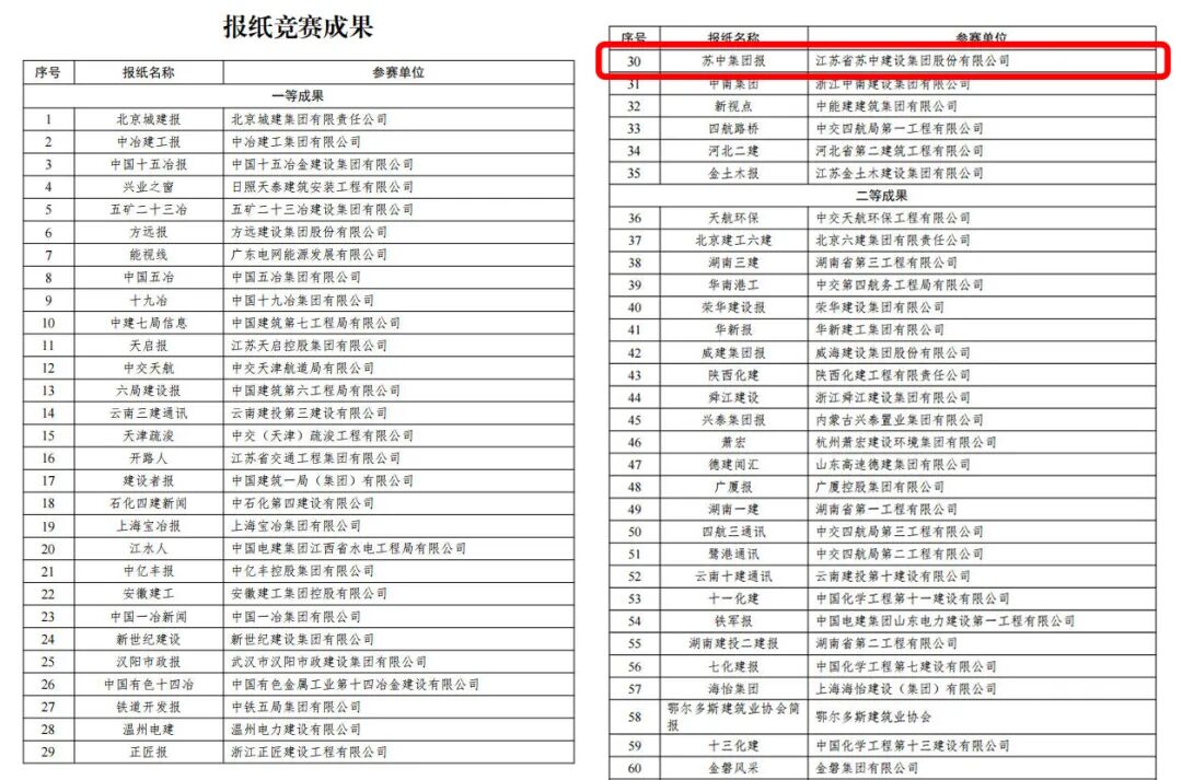10月中下旬,中國施工企業管理協會公布了2025年工程建設企業文化建設系列活動競賽成果,經企業申報、行業推薦、專家審核、綜合評定等環節,蘇中集團申報的“蘇中集團報” “蘇中集團年刊” “蘇中集團網站” “蘇中集團微信公眾號”等四項企業文化建設成果分別榮獲報紙競賽、期刊競賽、網站競賽、公眾號競賽一等成果,集中彰顯了蘇中融媒體四大核心平臺的行業認可度。